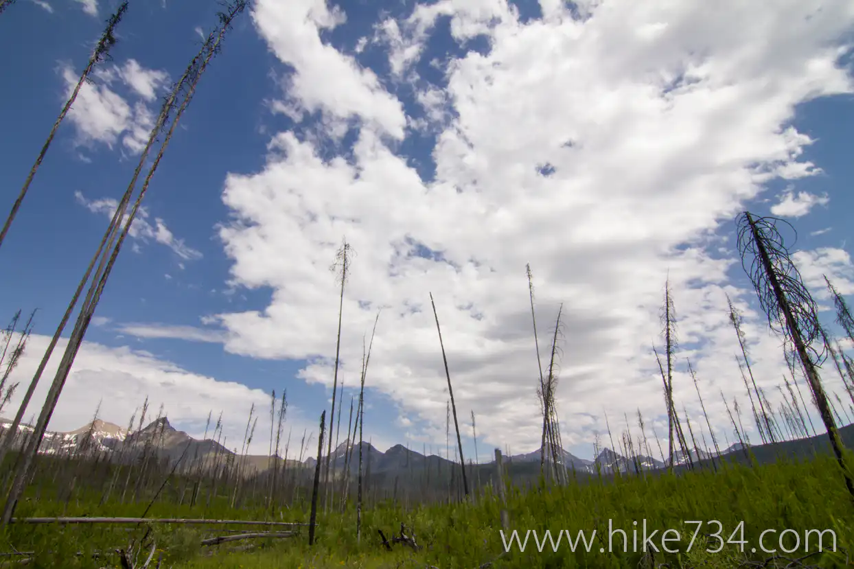 This alternate out and back route to Akokala Lake starts in a meadow off the Inside North Fork Road, then quickly heads into the burned forest area until it meets up with the Akokala Lake Trail (from Bowman Lake).
