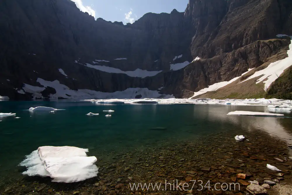 Icebergs float in an emerald lake surrounded by cliffs rising more than 2,000 feet above the water. This trail is popular for a very good reason. Although the first 0.2 miles have a steep angle, it quickly mellows out to a nice, gradual grade as you break out into incredible views. The meadows on the slopes above you are frequented by bighorn sheep and grizzlies. Mountain goats can often be seen in the cliffs.