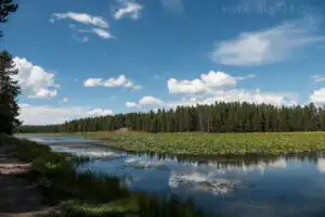 This trail goes up through the sagebrush meadow, then through a nice lodgepole pine forest. Shortly thereafter, you reach the far, north end of the lily pad covered lake. From here, the trail travels along the shoreline with many opportunities to see waterfowl amongst the lily pads.