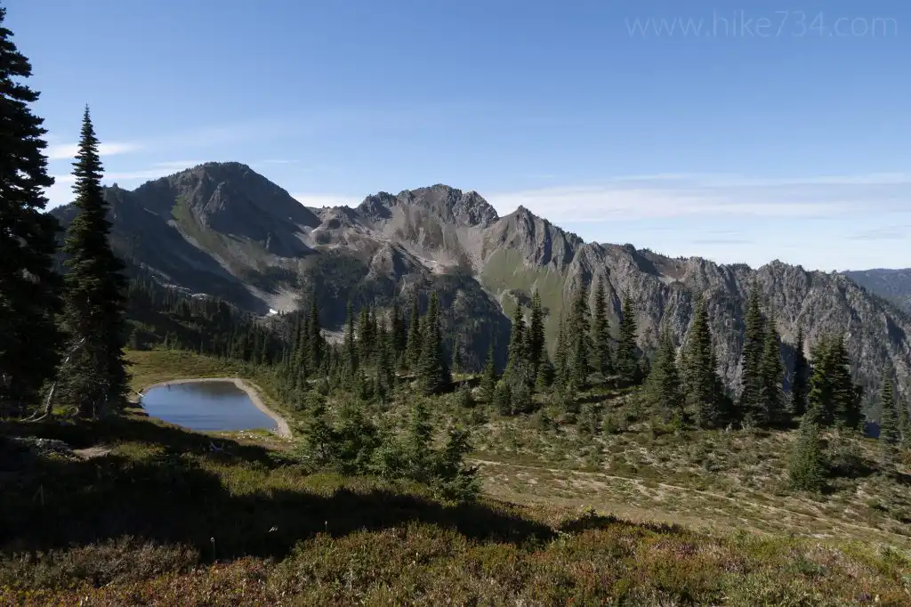 The trail continues climbing along the playful creek, crossing it numerous times. You spend more time in open meadows with views to rugged ridges high above. The trail makes its final approach to the pass as it switchbacks up the headwall through berry bushes and flowering meadows of heather near the pass. At the elevation sign for the pass, head east on the trail immediately behind the sign to go up to Oyster Lake and even better vantages. Views are obscured to the south, but glaciers on Mt. Carrie and Mt. Olympus can be spied through the trees.