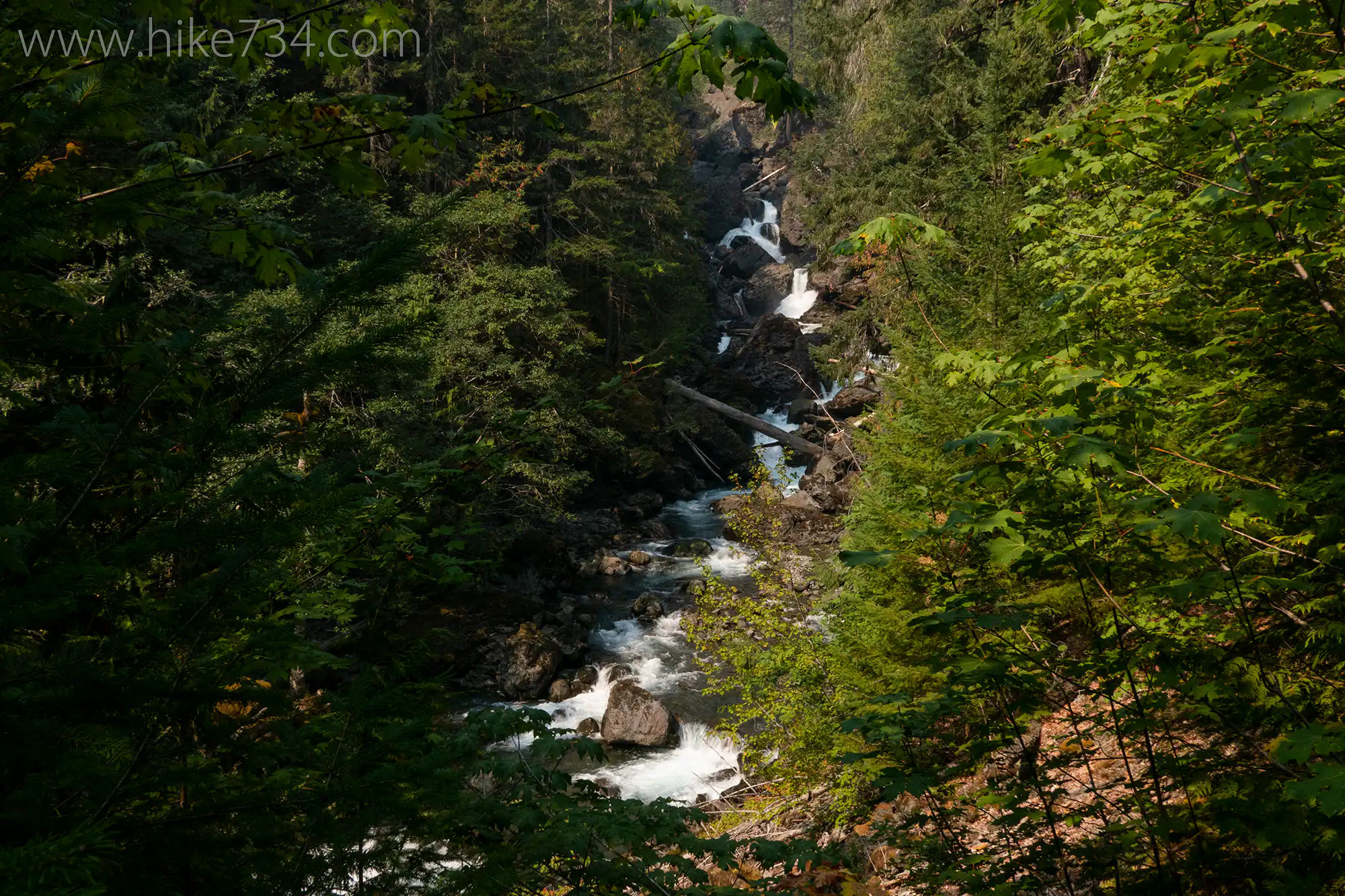 The path switchbacks about 100ft/30m above the washout, with views of the surrounding valley, before dropping down along the road and officially entering into Olympic National Park. The trail follows the river up, first alongside a sublime section, then high above it out of sight.