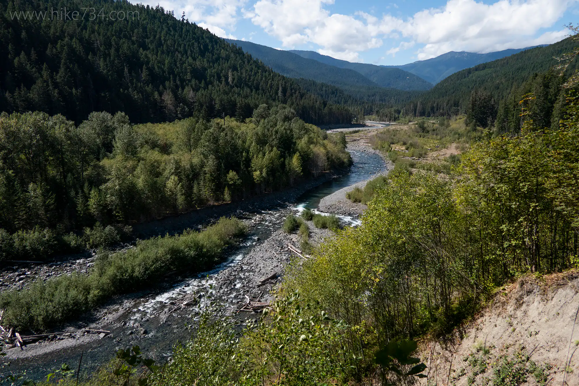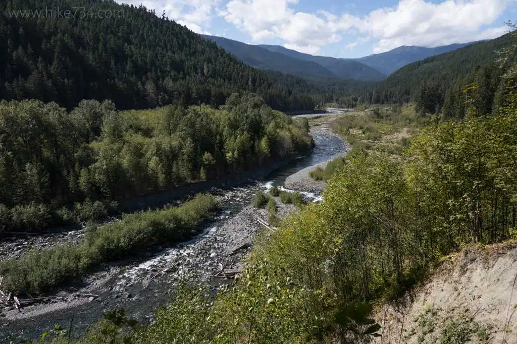 There are no geysers in this valley, but this stretch of the Elwha River delights with the many personalities of the river and some cultural history. The broad trail gently climbs through a forest of large trees and a wide variety of plant life. Views across the valley are sparse initially as you travel high above the river, but a great vantage is found by taking the overlook trail that drops off to the right.