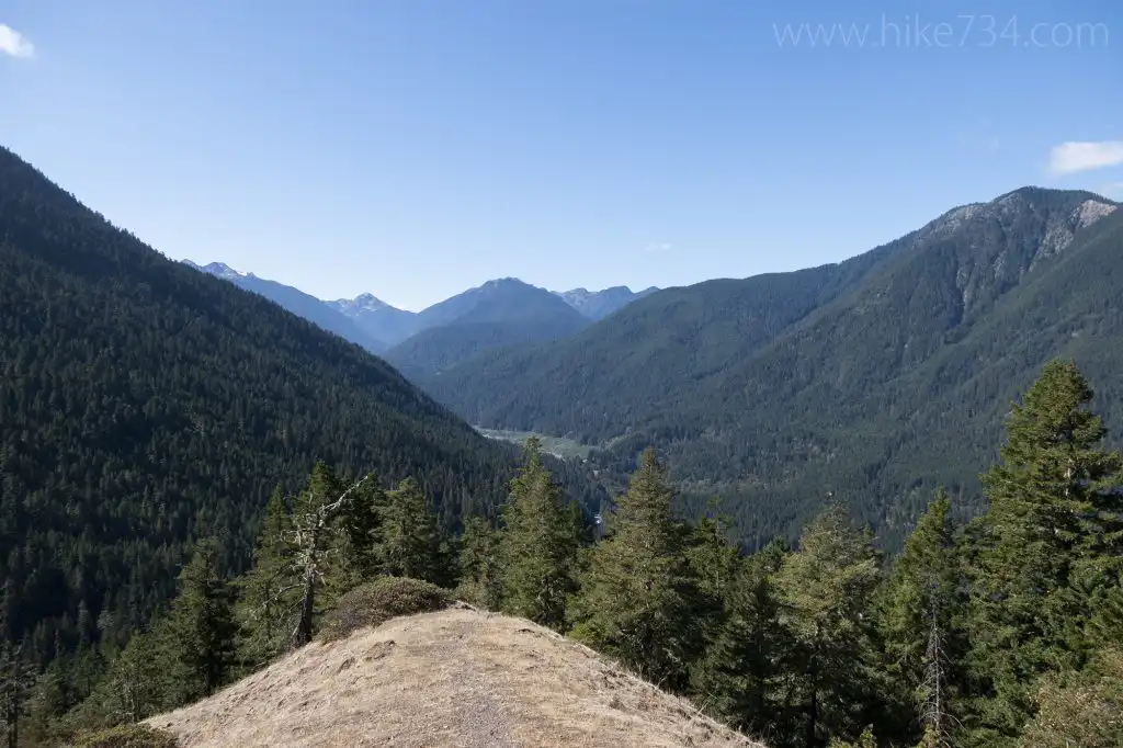 The trail begins aggressively switchbacking up through the trees with a few views looking up the Griff Creek drainage. Your first great vantage is at the spur trail for the signed Rock View Point, where you’ll have exceptional views of the Elwha River Valley.