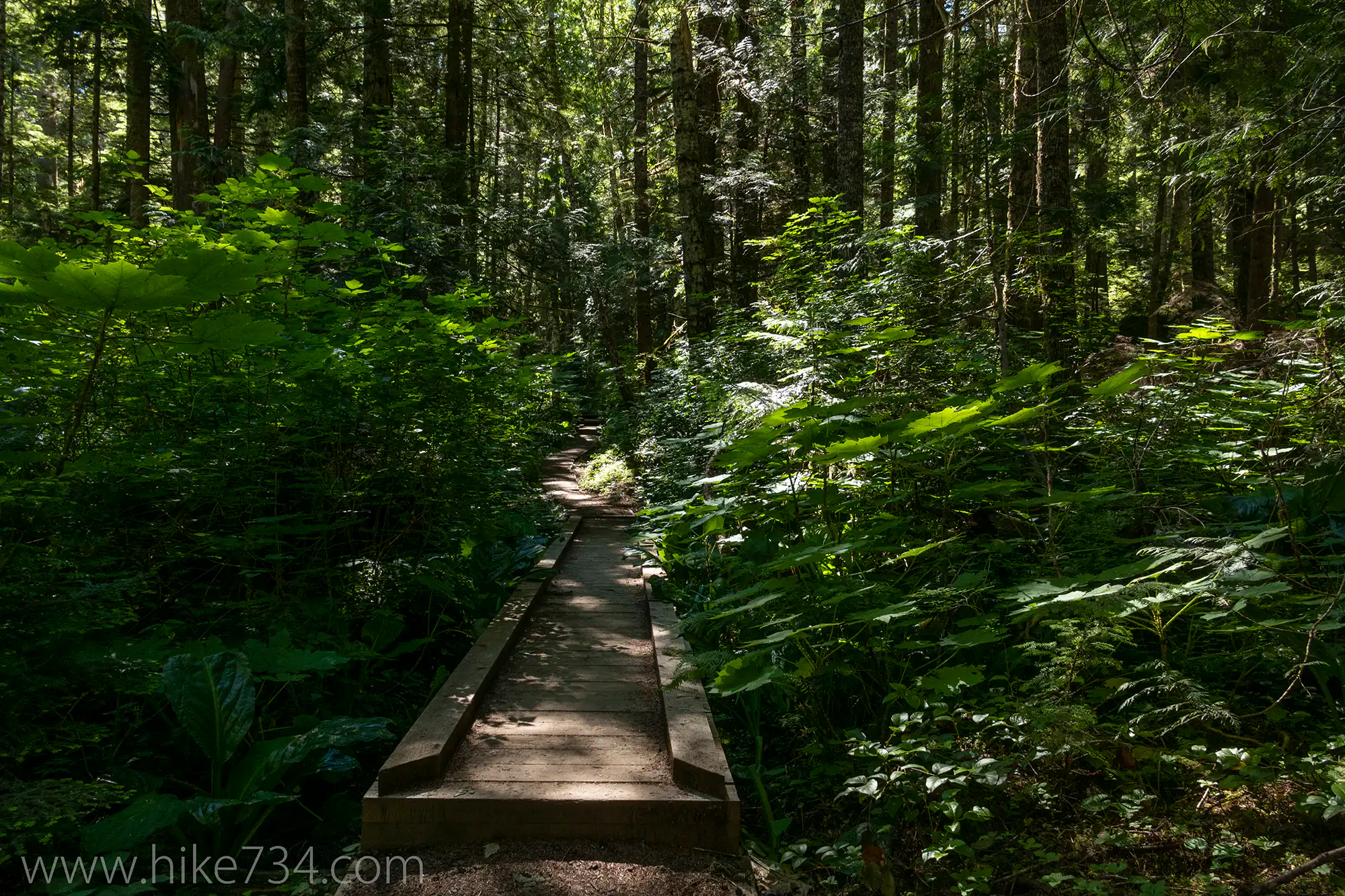It gently gains some elevation, crossing over a few feeder streams before gradually descending towards Lake Creek. You first hear the creek, then get glimpses of it as you traverse along the steep canyon. A large, fallen tree across the trail signals the park boundary and the turnaround.