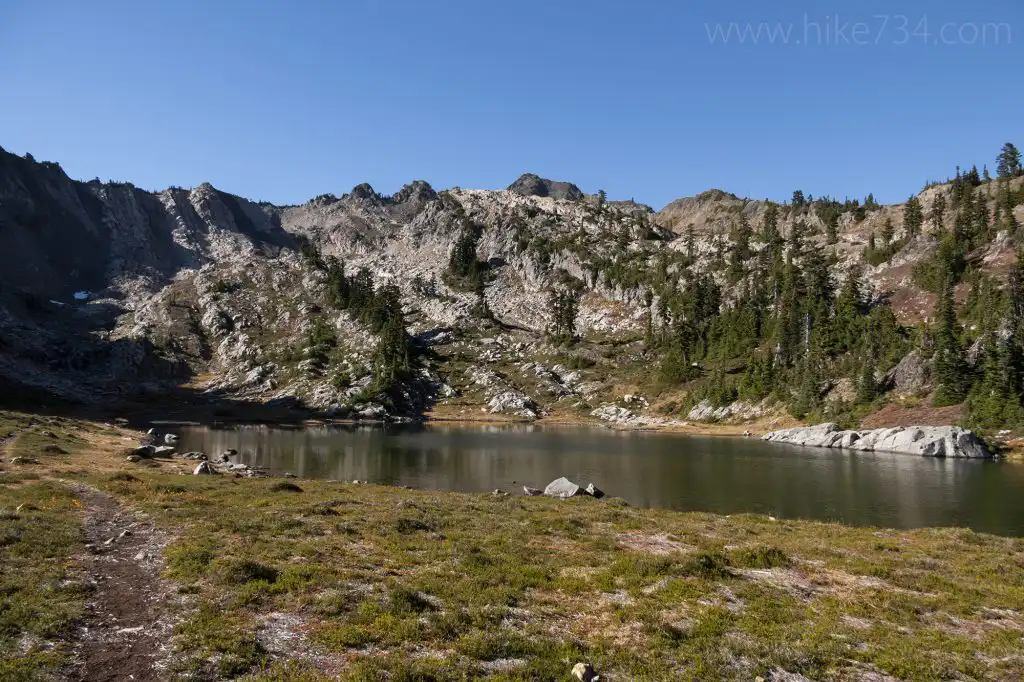 For a bonus panoramic view, cross the outlet stream to the first campsite. Look for the trail that continues across the meadow and work your way up 300ft/100m to the saddle between Mt. Skokomish and Mt. Stone.