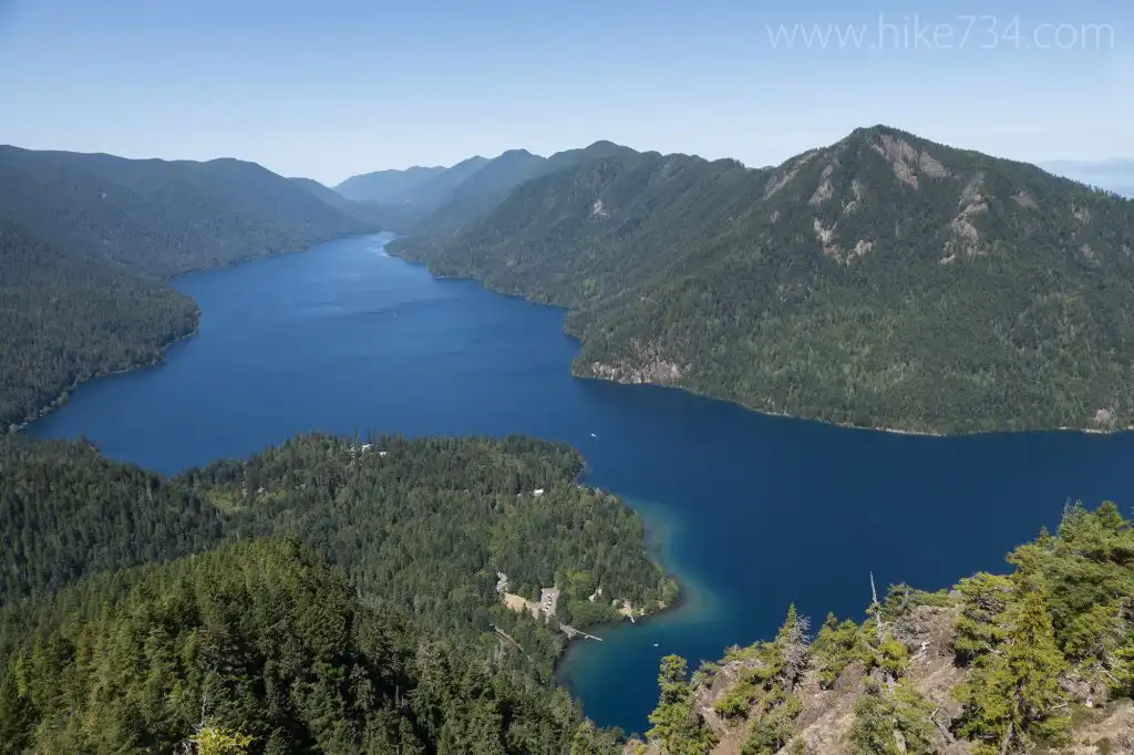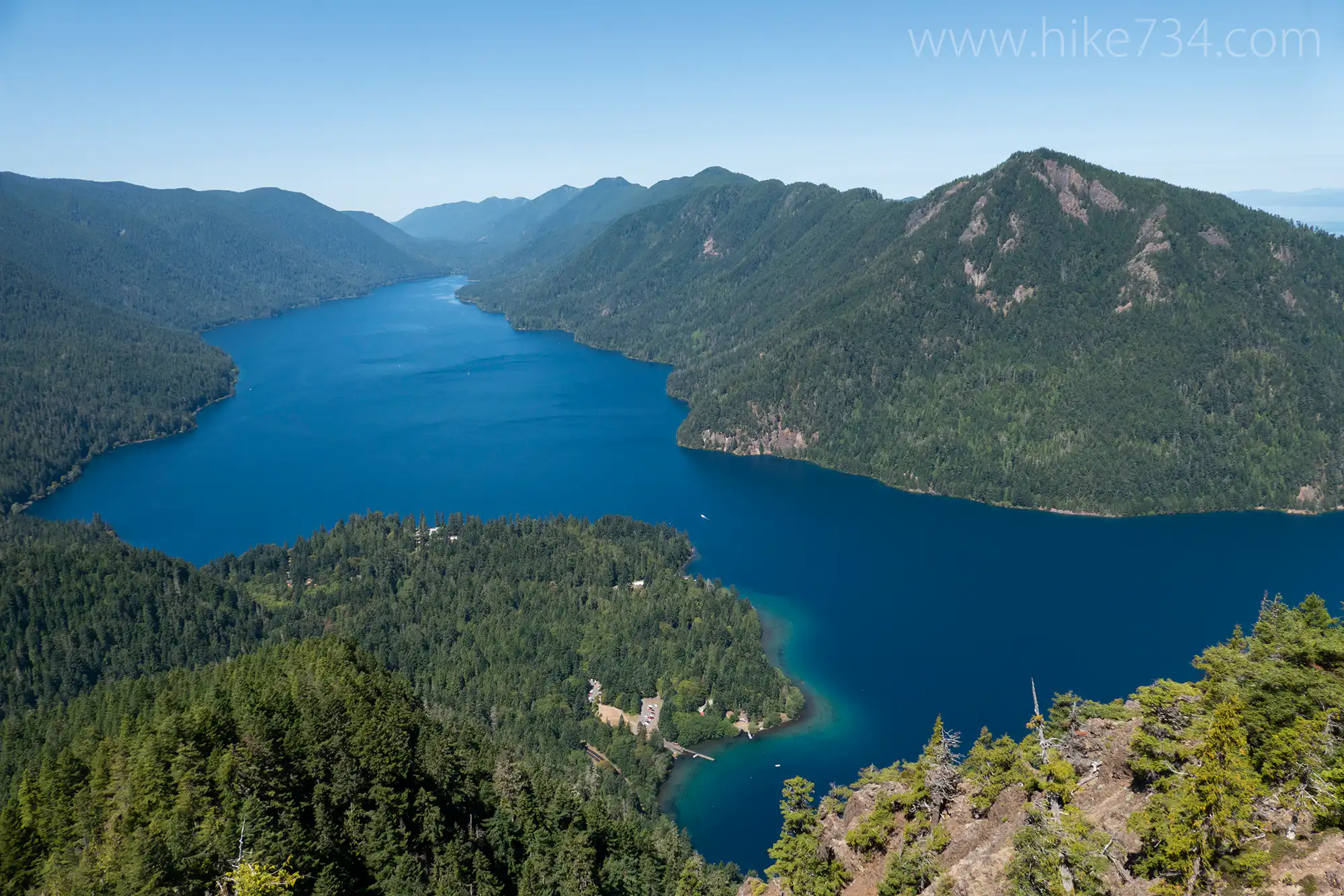 For the stunning views, however, continue climbing up to a knife-edge ridgeline. This is followed by a steep incline where ropes are necessarily present to hold onto as you pull your way up to the exposed, rocky outcropping with stunning views of the gorgeous Lake Crescent below.