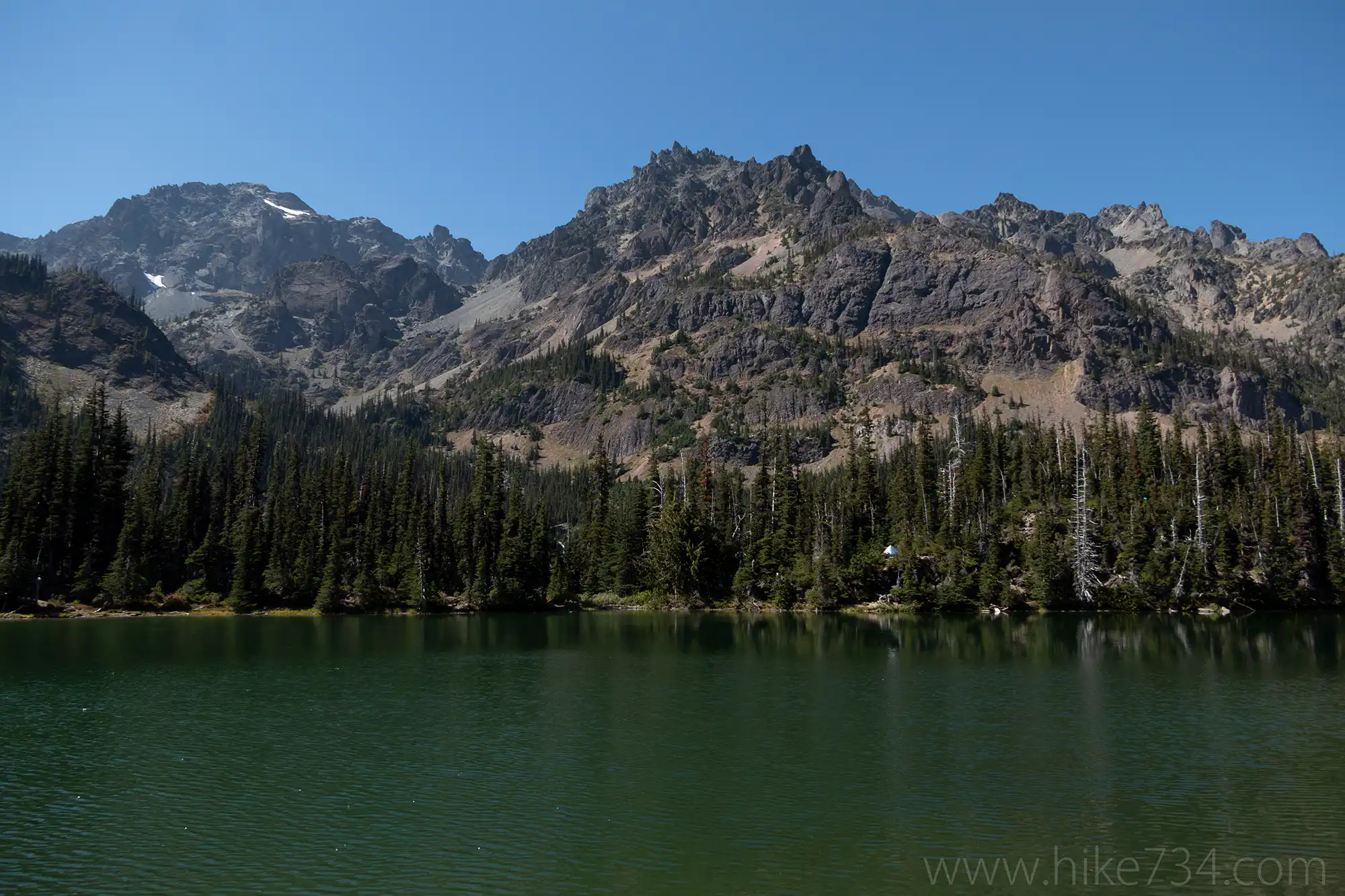 For those with extra energy, continue past the lake on the signed trail that works its way up past a marshy meadow to the moonscape upper basin for a truly exceptional experience. Here, alpine meadows and surreal boulder fields with glacial tarns are surrounded by Mt. Deception and other gnarled ridges.