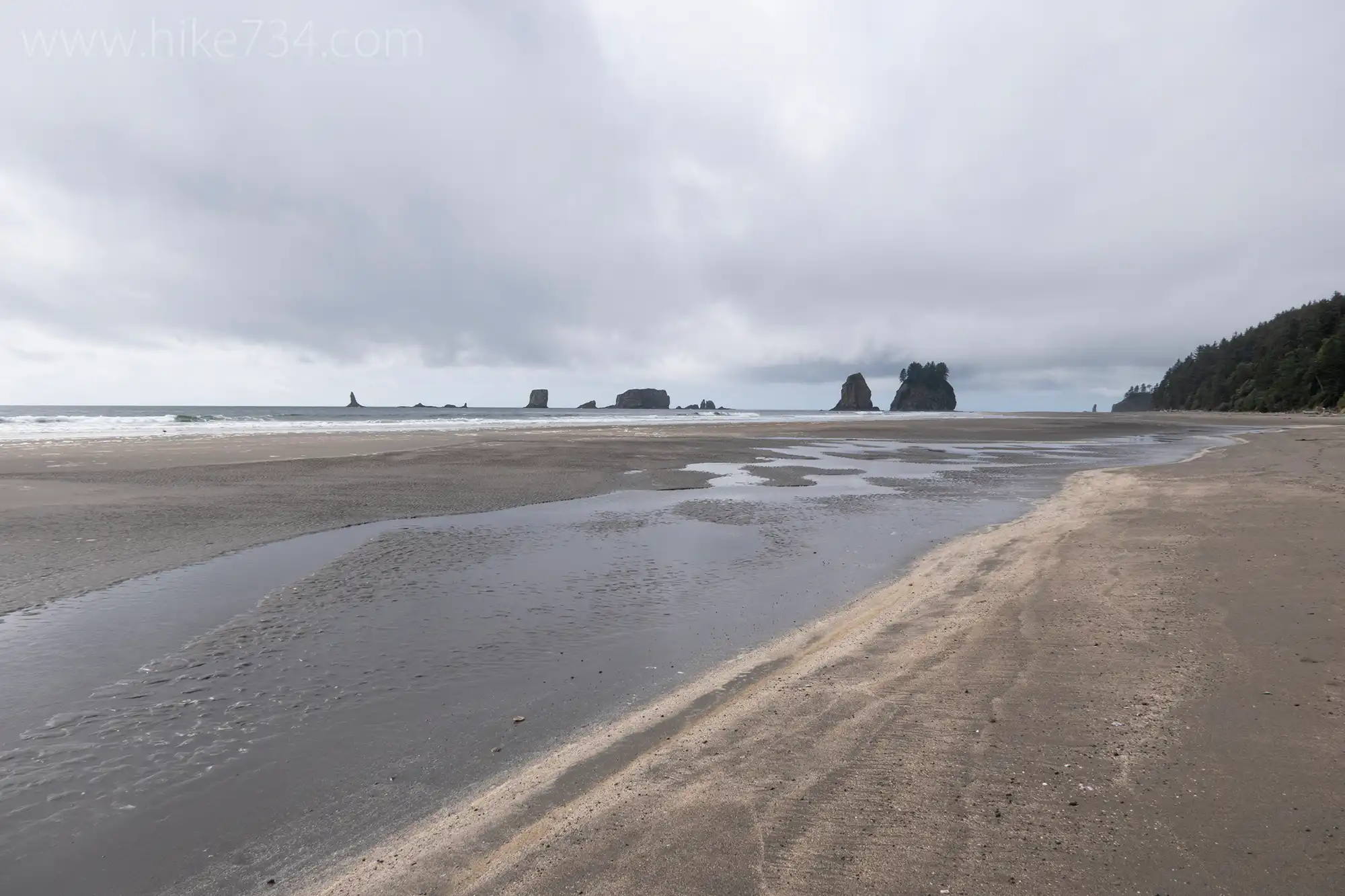 Once on the beach, however, the walking is easy as you can explore the tide pools to the north set under an arch. As you travel south, you realize that the island of Crying Lady Rock is hiding a series of spiky sea stacks called the Quillayute Needles that extend out into the surf. At the south end of the beach, the forested ridge towers like amphitheaters. Tide pools can be accessed here during low tide and a handful of rock arches are visible.