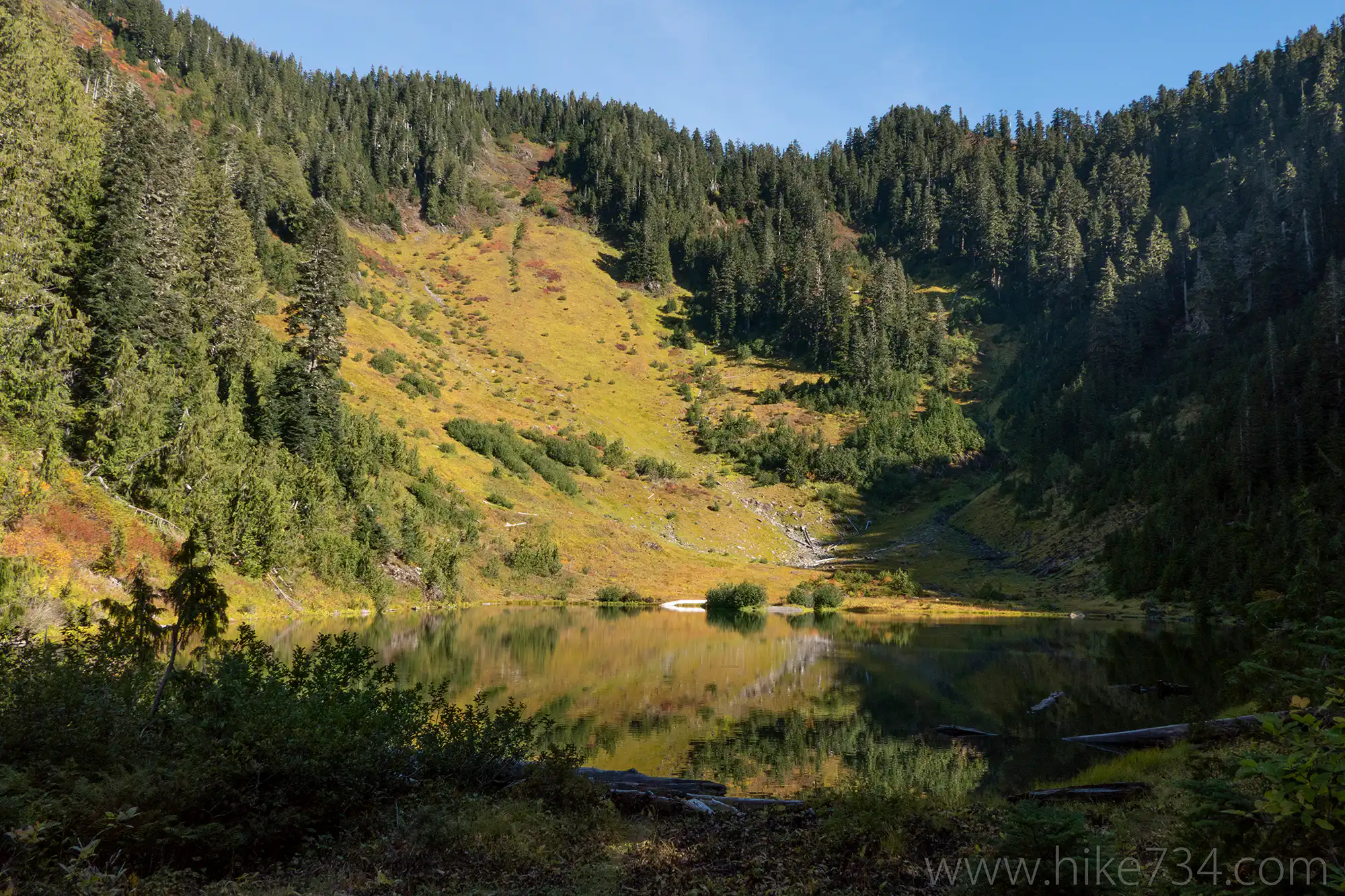 This remote trail takes you through beautiful forests to a quiet lake high in the mountains. You’ll walk the road past the washouts to the subtle, former trailhead at the switchback.