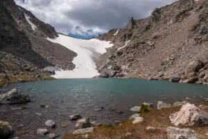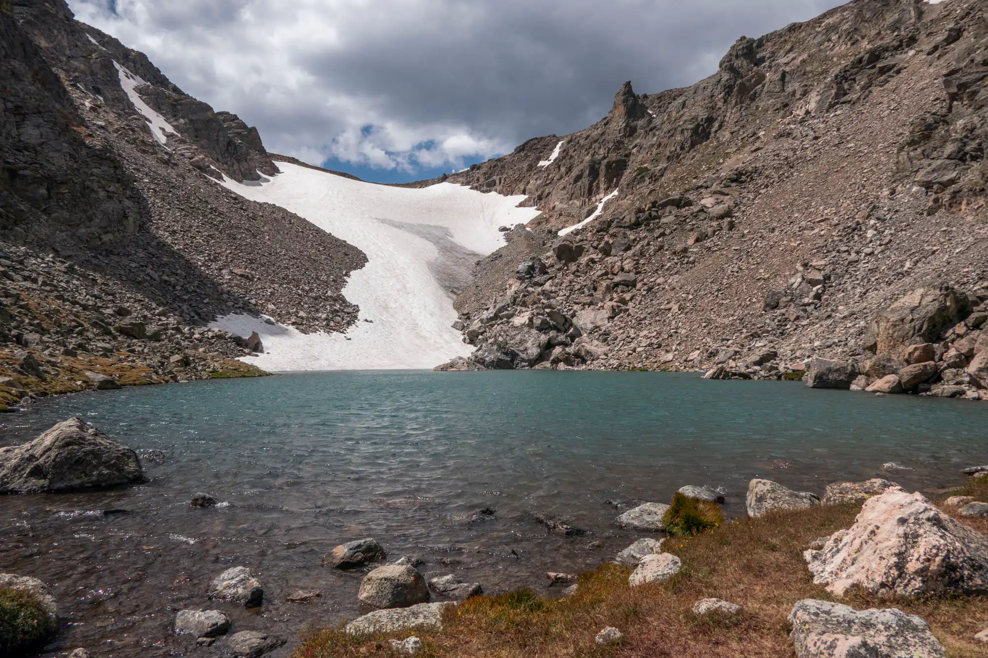 Immediately after crossing the creek take a right up the granite slab and the trail appears again. After a bit of climbing up through the forest, you emerge from the trees to an epic boulder field. The route can be tricky to find at times, but keep an eye out for cairns and pikas as you navigate the boulder field. As you get higher, a canyon named The Gash appears to the left capped with a triangular spire appropriately called The Sharkstooth. The trail steeply climbs up to the left of a snowfield at the head of the valley. Once above the snowfield, you come to the shores of Andrews Tarn, an emerald pool at the base of Andrews Glacier.