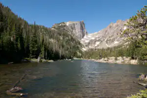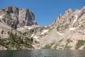 From your perch on the granite on the lake’s edge, enjoy the dramatic cliffs of Hallett Peak and the spires of Flattop Mountain at the head of Tyndall Gorge.