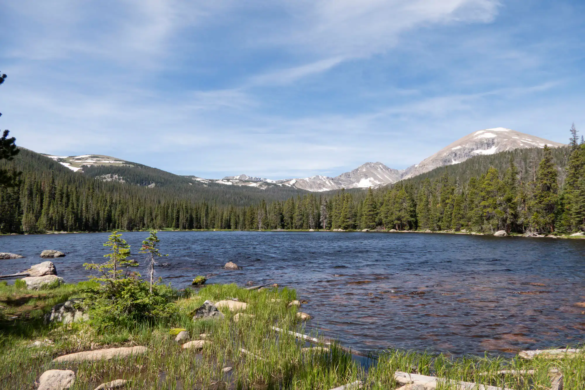 Tucked away in the Wild Basin area, this quiet lake offers views up towards Copeland Mountain.