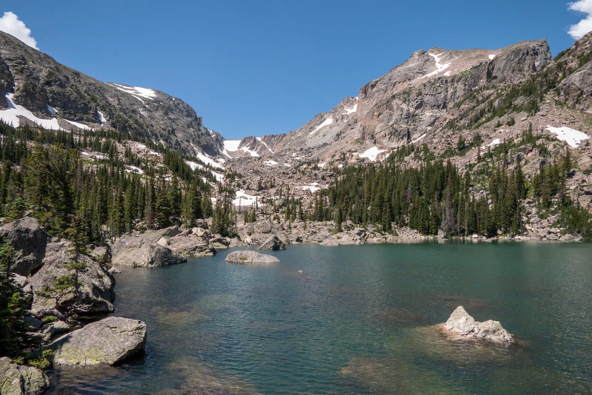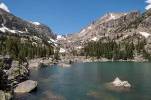 Return to the junction and continue towards Lake Haiyaha. The trail climbs up and around the ridge giving you more impressive views before heading into the canyon. Cross over Chaos Creek and take a right to head towards the lake. Don’t be fooled by the small ponds here, but continue through the boulders and past an impressive, ancient limber pine to Lake Haiyaha. Enormous boulders make up the turquoise-colored lake’s shore and provide a perfect place to sit and look up into the canyon above.