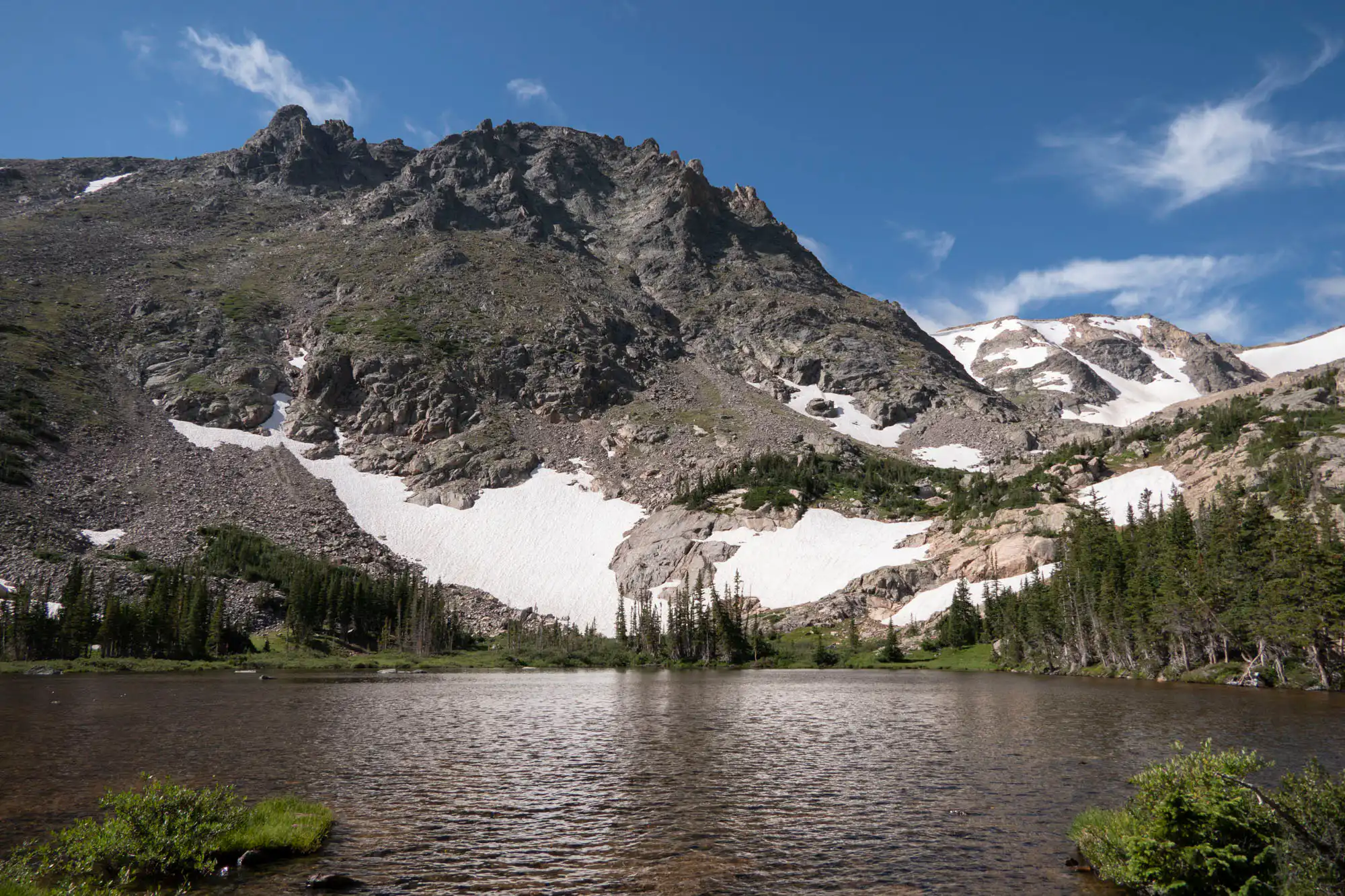 You’ll start along the eastern shore of the gorgeous Bear Lake before taking a right and climbing through a grove of aspens embedded in a boulder field. Views look south towards summits including Longs Peak towering over dramatic drainages. Take a left as you approach the top of Bierstadt Moraine to head towards Odessa Lake.