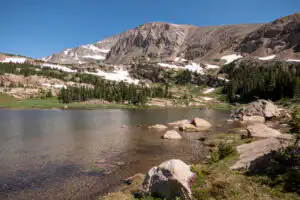 As you approach the lake, rounded Chiefs Head Peak comes into view with its crumbling gray cliffs. Numerous rocky ponds appear and disappear to your left until you drop down to the lake. A waterfall cascades over peach-colored boulders, and a flowering meadow rings the lake. Find a nice rock to enjoy a snack, being careful to avoid treading on the sensitive vegetation.