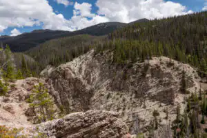 Continue past the meadows and into the trees where the trail crosses the Colorado River and begins climbing. Take a right, then cross over the cascading Lulu Creek. The trail continues climbing, eventually popping out along the edge of the canyon. After crossing Lady Creek and wrapping around the drainage, look back at the creek where a delicate waterfall drops down into the canyon. Numerous crazy rock formations are scattered about.
