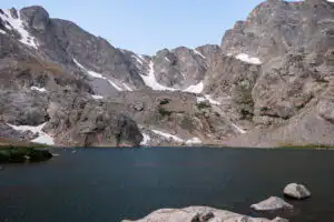 The trail is a bit tricky to follow, but look for cairns and other hikers on your way up to Sky Pond. Tall granite walls surround the lake in a stunning, varied display that provide the perfect backdrop to this sparkling lake.
