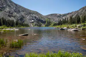 The trail eventually climbs up into a sublime meadow section. Hikers ascending Mt. Ida can be seen along the ridgeline up ahead. Flower-laden meadows line Timber Creek which you’ll follow up to the lake. From the marshy foot of the lake, you’ll have a pick of rocks to choose from to sit and admire the rocky cliffs of Mt. Ida as the lake sparkles below.