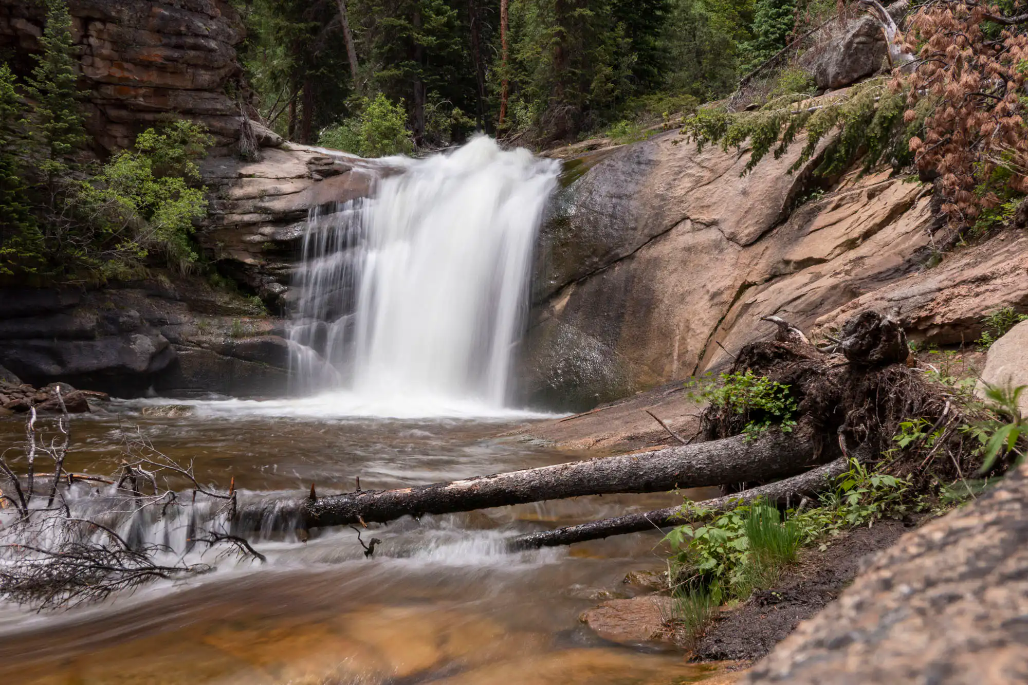 Stay left through the junctions as you cruise through parked out forests and enter back into the national park just before the falls. Keep an eye out in the stream for native cutthroat trout. The waterfall appears as the canyon narrows. The first section falls as an elegant curtain into a pool. After exiting the pool, the water races down as an exciting second fall.