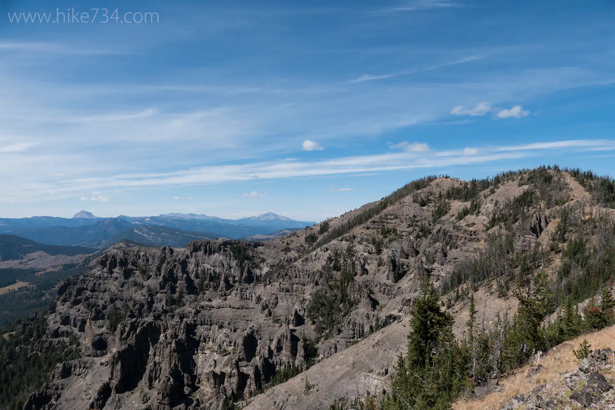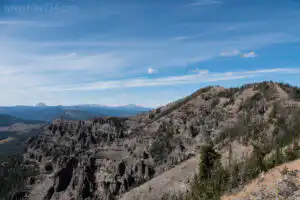 As the trail reaches the head of the drainage, it begins to climb, predominately through trees, up to the ridgeline. Take a right at the junction with the Sky Rim Trail that runs along the ridgeline. This is also the boundary of Yellowstone. Unlike many trails that traverse a ridge, the Sky Rim Trail stays true to the top of the ridgeline. While this maximizes views, which are plenty, it also maximizes elevation by going up and down almost every point along the ridge.