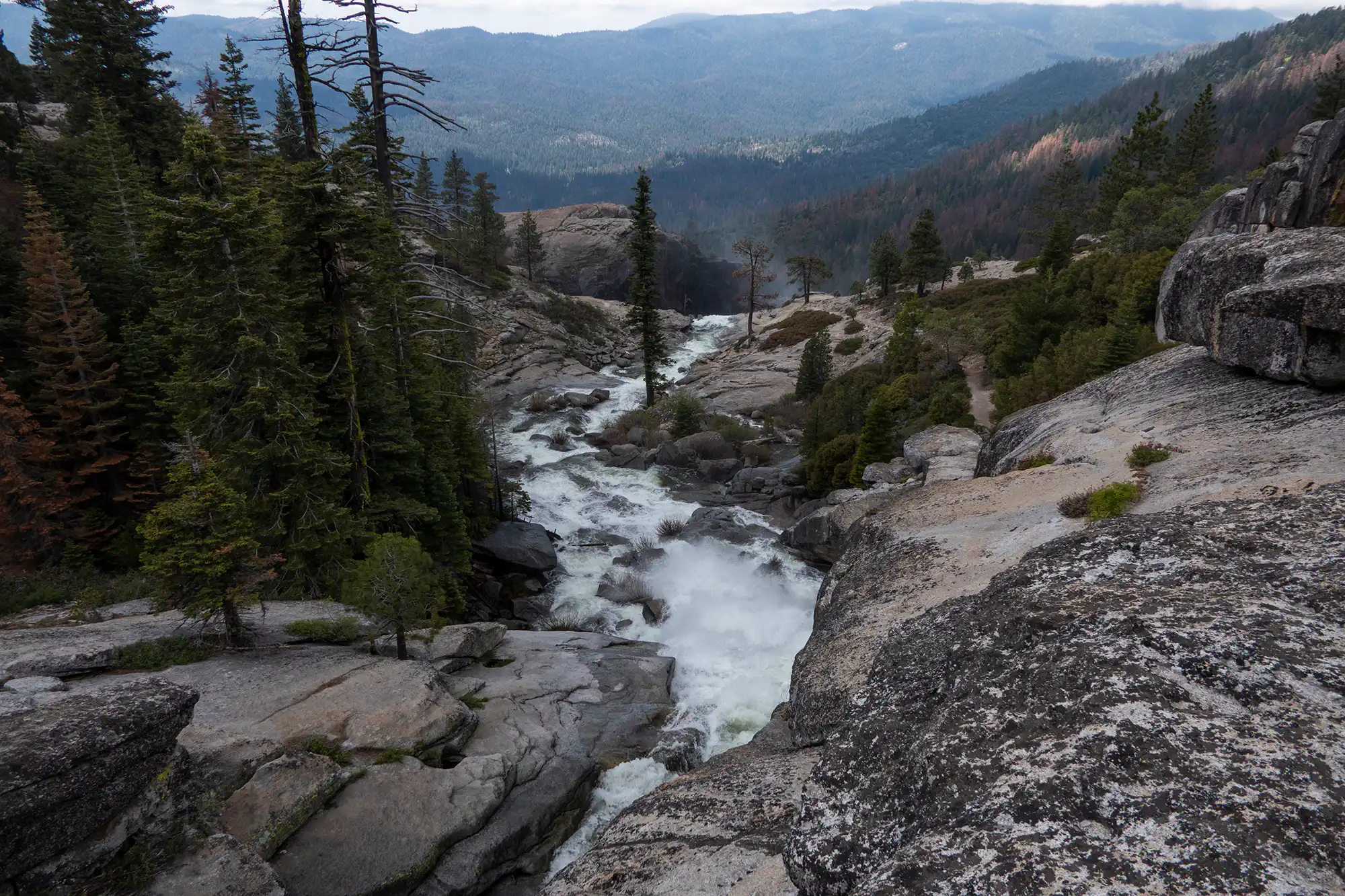 The final approach to the waterfall offers expansive views as you make your way up steps carved in the granite. You reach the top of the largest fall which disappears in the rising mist below. Follow up a few more cascades to a granite landscape scattered with trees, which makes for a great lunch spot before heading back down.