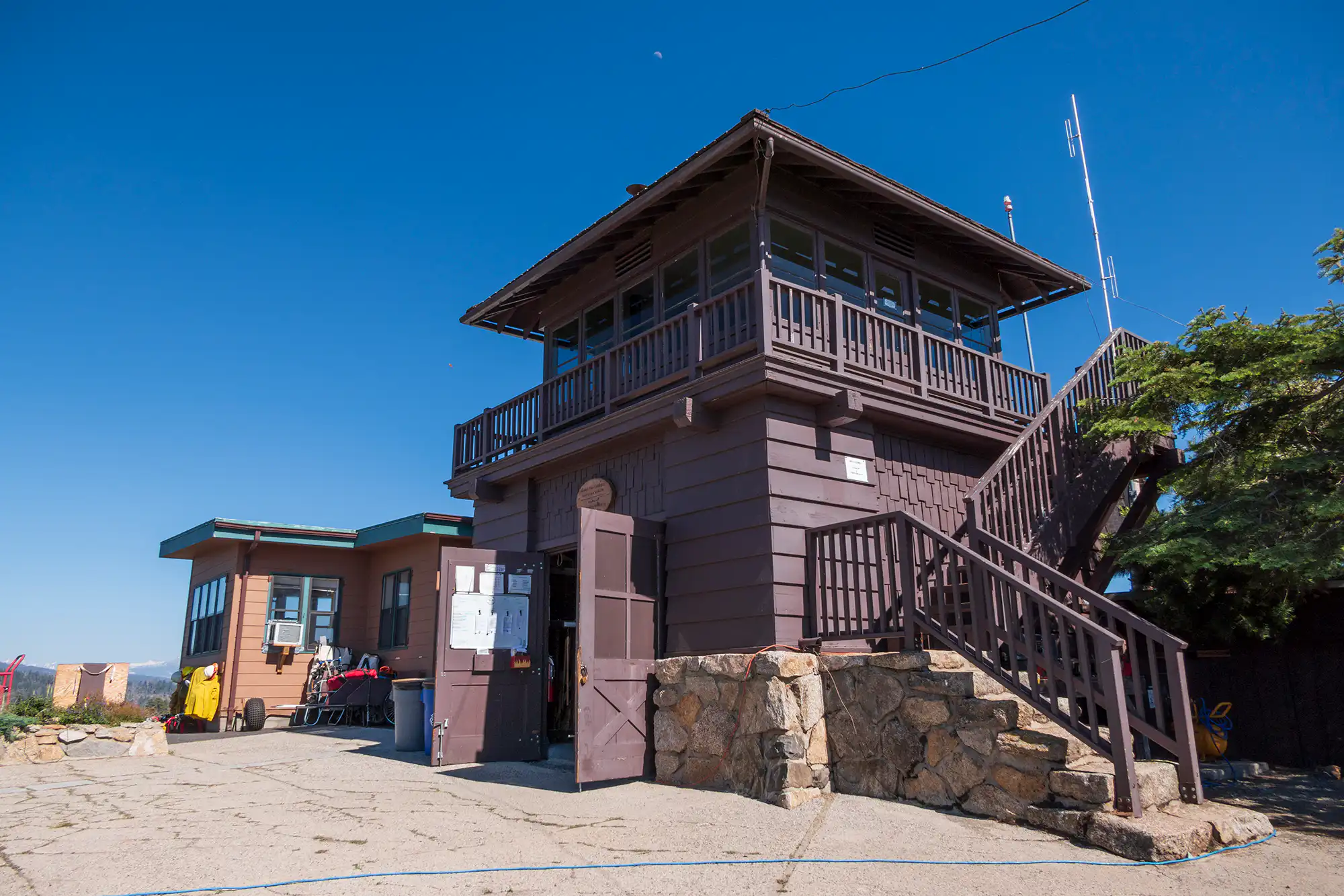 You can climb up into the lookout where they have historical information. The walkway outside gives you views looking east to the distant peaks in Yosemite.
