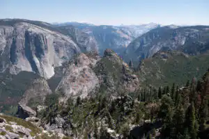 In the spring, Ribbon Fall wisps down the cliffs next to the massive, famous cliff of El Capitan to the east. Cathedral Rocks and Leaning Tower are immediately below you. While Bridalveil Fall is also right below you, it’s obscured. You’ll need to continue further on the trail to Crocker Point and Stanford Point to see it (see Stanford Point).