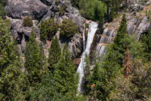 A pleasant waterfall awaits at the end of this quiet hike that requires a bit of effort for the reward. For the first 3.1mi/5km, the trail climbs 1,400ft/420m through a forest of oak, then fir and pine. Along the way, you’ll get views of the surrounding wooded ridges. Much of this section is along a south-facing slope and can be very hot, so bring plenty of water.