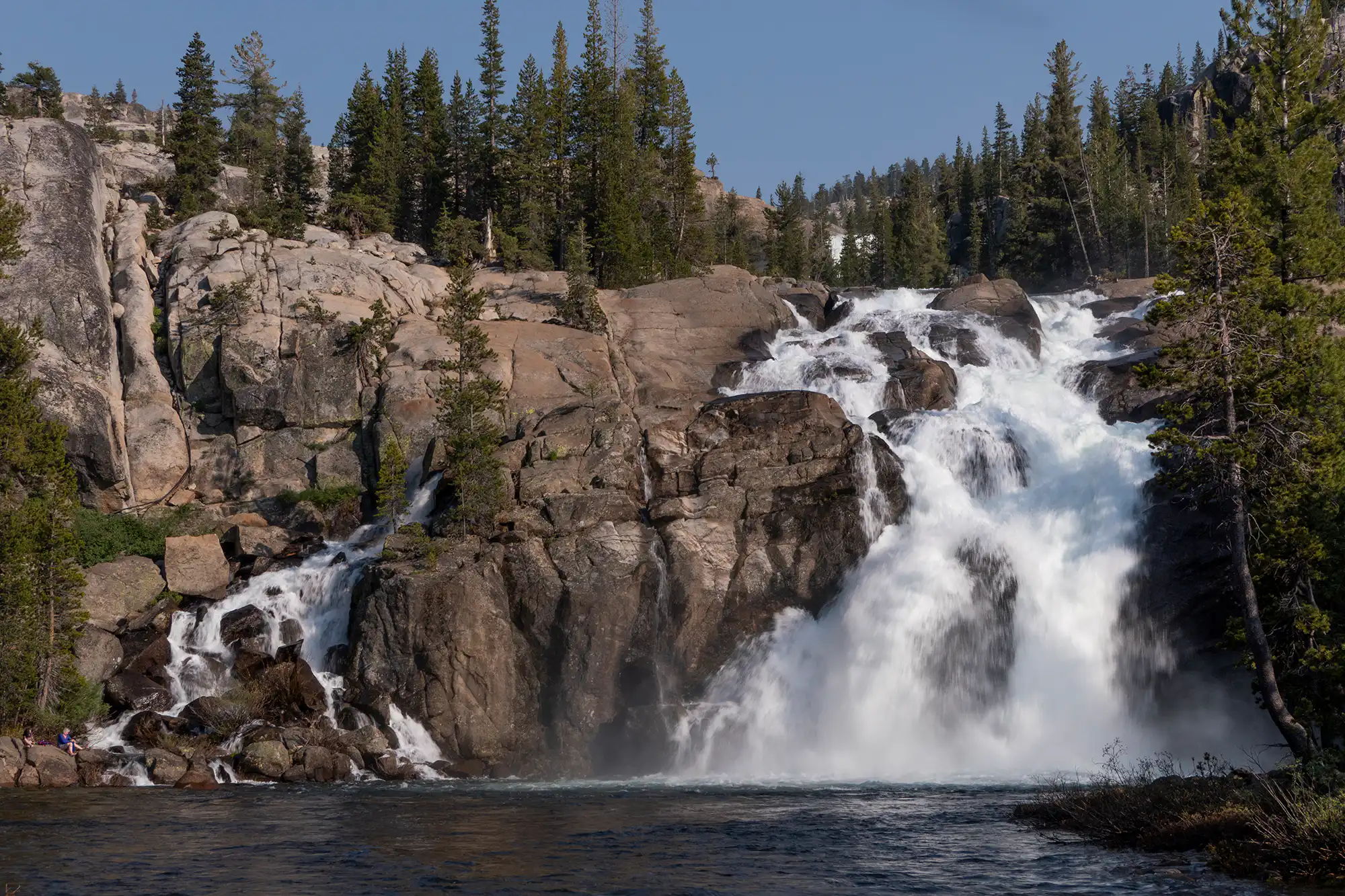 While the prolific cascades could be mistaken for Tuolumne Falls, this powerful waterfall (approximately 4mi/6.4km into the hike) is unmistakable as it drops 100ft/30m right alongside the trail. You’ll then wind through the forest and drop down to the flat area where Glen Aulin High Sierra Camp sits. White Cascade drops into the large pool in this area. Take the bridges over to the camp. Turn around here or continue on down the river to visit California Falls, Le Conte Falls, and Waterwheel Falls (see Waterwheel Falls for description).
