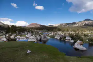 After you climb about 700ft/210m the trail levels out as it enters the grassy, alpine meadows. This other-worldly landscape of low-growing green vegetation is dotted with large, gray boulders and pocket ponds. Crumbling gray ridges and the red ridge of Gaylor Peak are to the north, while mammoth summits such as Lyell Peak dominate the view to the south. The trail traverses through the boulders and ponds to the edge of the lake tucked below a treed ridge and crumbling rock.