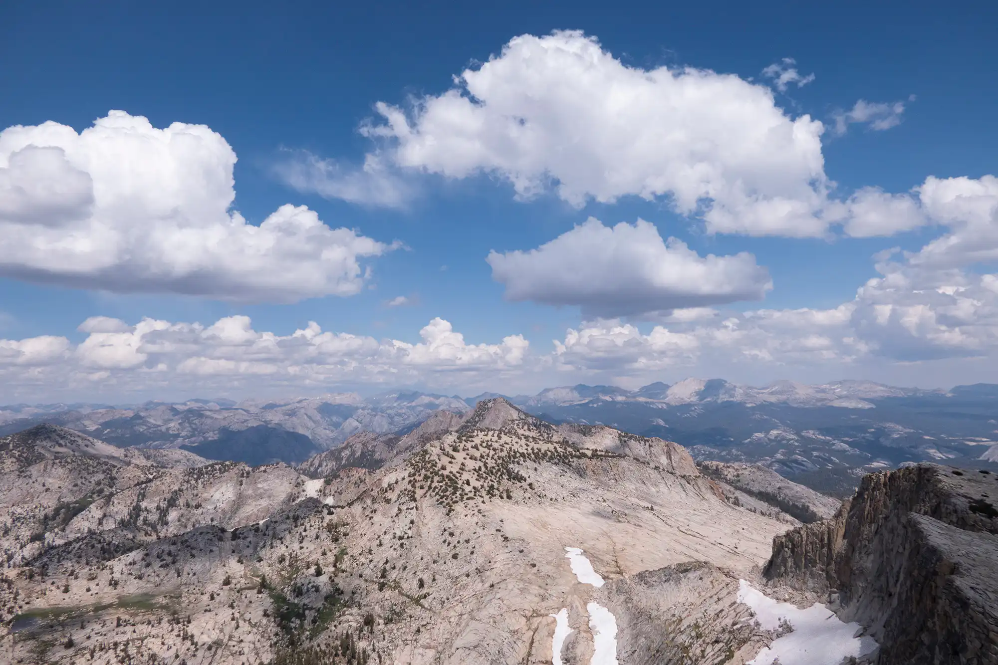 The summit is reached via some easy climbing up the granite where a radio antenna sits. While views have been spectacular on the way up, the summit reveals amazing views of the mountains and drainages to the west. All of Yosemite seems visible from here. Explore the exceptional terrain featuring numerous rock formations in the alpine meadow.