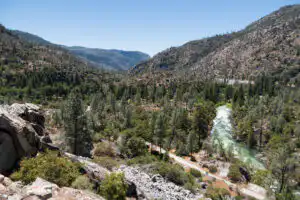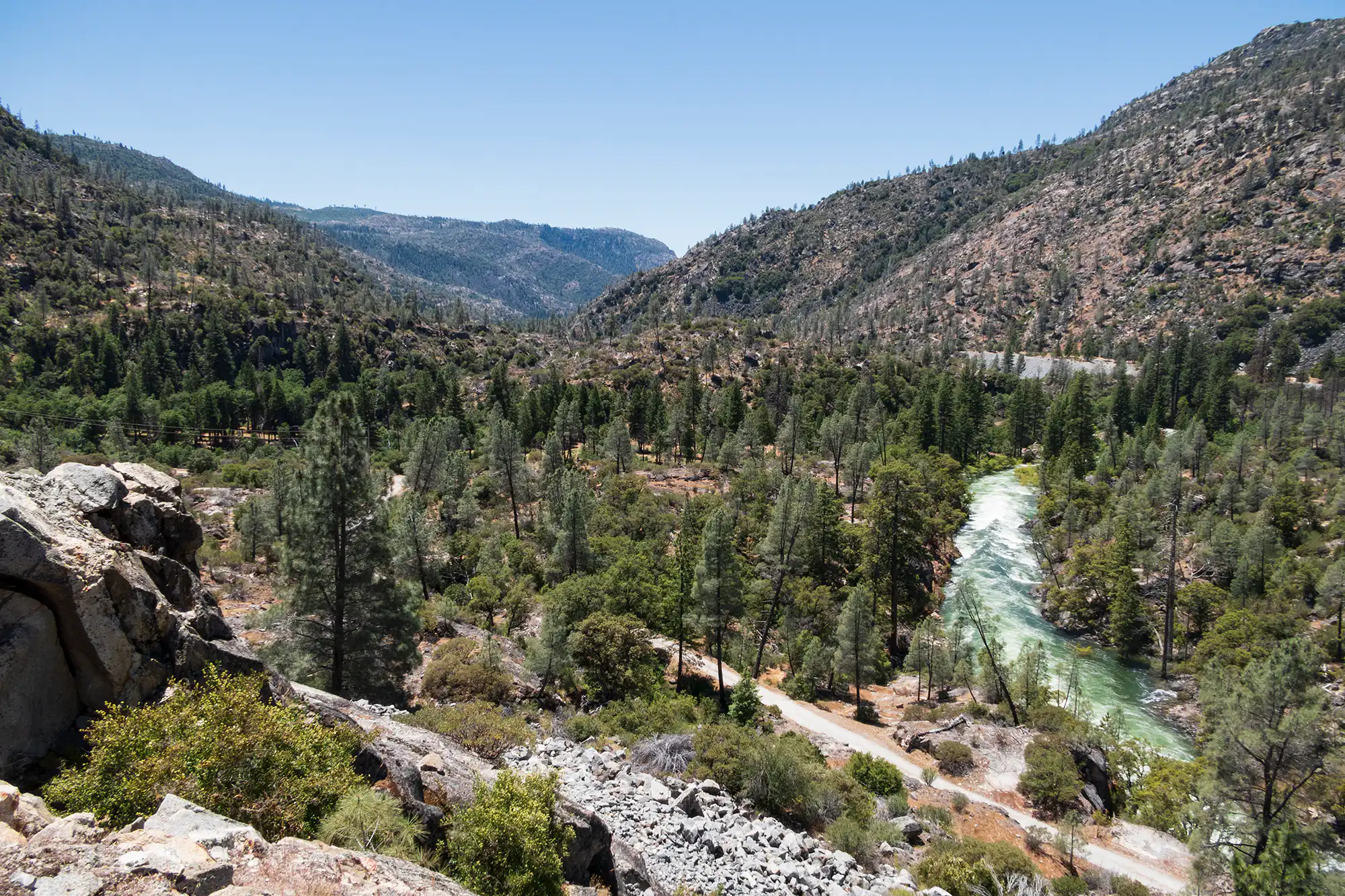 This hike explores the Tuolumne River at the base of the Hetch Hetchy Reservoir. Instead of crossing over the dam, walk the gated road down into the canyon. Before you get to the river, you come to a fork in the road.