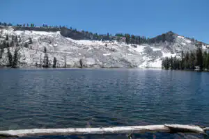 The trail gets steeper as it climbs away from Horizon Ridge. Views begin to peek to the north. After wrapping around the ridge, just off trail to the north, a wonderful panorama opens up. The trail then descends to a stone ski hut on the shoreline of the lake. Horse Ridge looms large at the opposite end of the lake with crumbling granite accenting the cool, blue water of the lake.