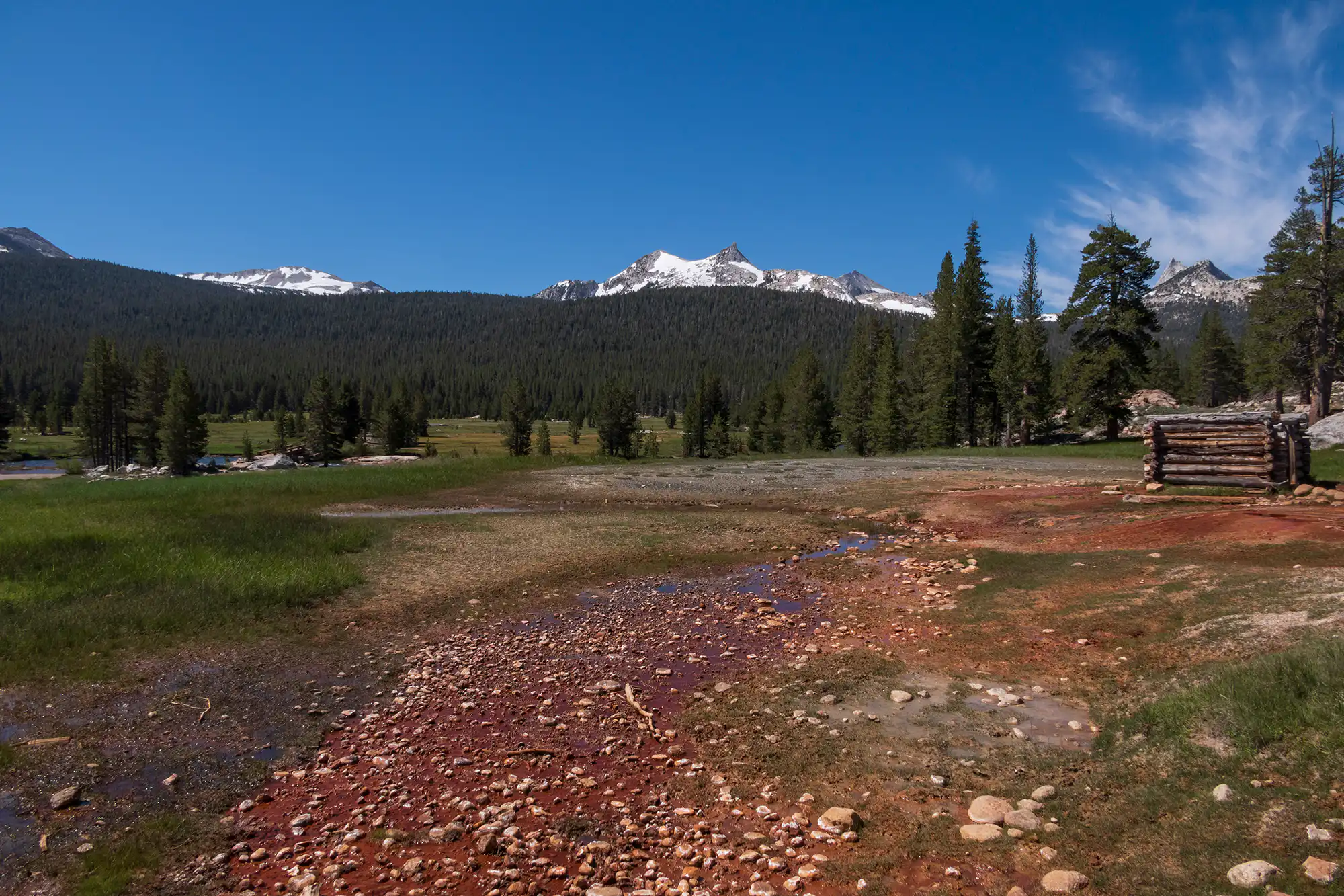 The area around these carbonated springs is soggy, but a path leads you to the roofless, log structure surrounding the spring. Parsons Lodge is an old, rock building used for interpretive programs. From here, take the bridge over the Tuolumne River out to the meadows where a wide path takes you an additional 0.6mi/1km to the road.