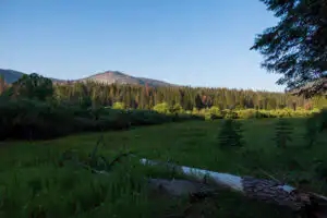 As you reach the top of the loop, a handful of seasonal creeks cross the road. Once on the other side of the meadow, open forests carpeted with the aromatic plant, Mountain Misery, become dominant. Views of the meadow increase. This stretch parallels the road which makes it a bit noisy, but the wonderful views of the meadow make up for it. Cross the road which heads back to the lodge to complete the loop.