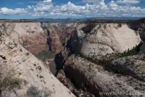Starting on the East Rim Trail near the East Entrance of Zion, you travel along a broad trail through slickrock and desert shrubbery. The trail starts off fairly level with some soft, sandy spots along the way. The trail switchbacks at Cave Canyon and begins to climb. You wrap around the point that separates Cave Canyon and Jolley Gulch, with the latter being an impressive canyon. At almost three miles, the trail crosses Jolley Gulch. At the crossing, you stand on a rock slab that looks straight down into a writhing fissure. Years of water eating away at the sandstone have created a dramatic slot canyon to enjoy from a great vantage.