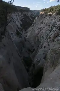 At almost three miles, the trail crosses Jolley Gulch. At the crossing, you stand on a rock slab that looks straight down into a writhing fissure. Years of water eating away at the sandstone have created a dramatic slot canyon to enjoy from a great vantage. Turn around here and head back to your car. (For more extended trips along the East Rim Trail, check out Deertrap Mountain, Cable Mountain, and the East Rim Summits hikes in the 15+ mile section.)