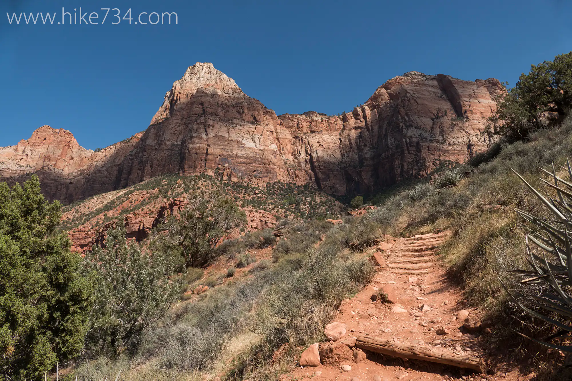 This hike takes you to a nice vantage of Zion Canyon. The Watchman Trail begins by briefly following along the Virgin River in the shade of the cottonwoods, then out in the sun for the majority of the hike. From the Zion Canyon Visitor Center, you follow the eastern shore of the Virgin River and head upstream on a paved path. Following the signed route, you cross a road and begin working your way past staff housing to the knoll below Bridge Mountain.
