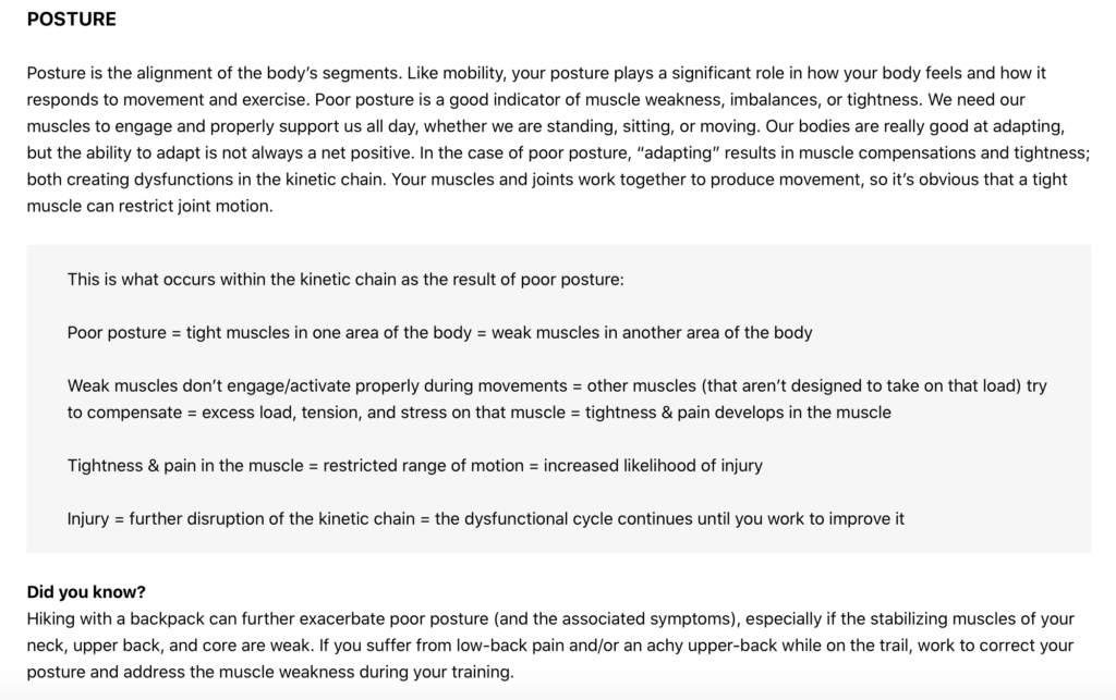 I’ve taken my love of hiking, first-hand experiences, and knowledge as a certified personal trainer to create the HIKE-ABILITY Training Program. Check out a little “sneak peak” below to get an idea of what’s included in the program.