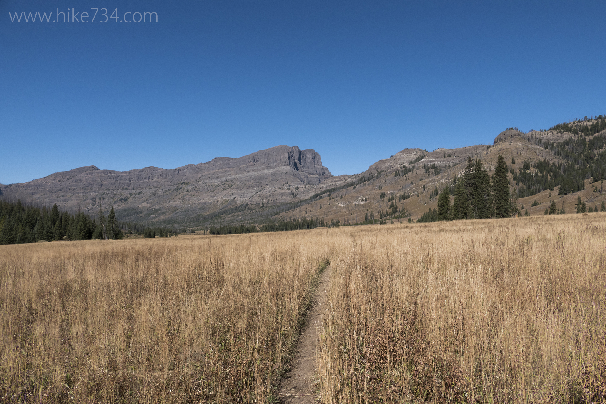 I emerged from the trees to see this vast, mountain meadow. I was able to cross Pebble Creek by hopping on rocks, but earlier in the year, it would be a ford. Once I got across, all I could say was, “Wow!” This broad, grassy meadow was fantastically beautiful. The back side of Barronnette Peak and Mt. Hornaday created a dramatic backdrop. Pebble Creek was lined with willows and the surrounding hillsides were covered with vegetation amongst a stand of gray trees from a former burn. The habitat up there begged for wildlife.
