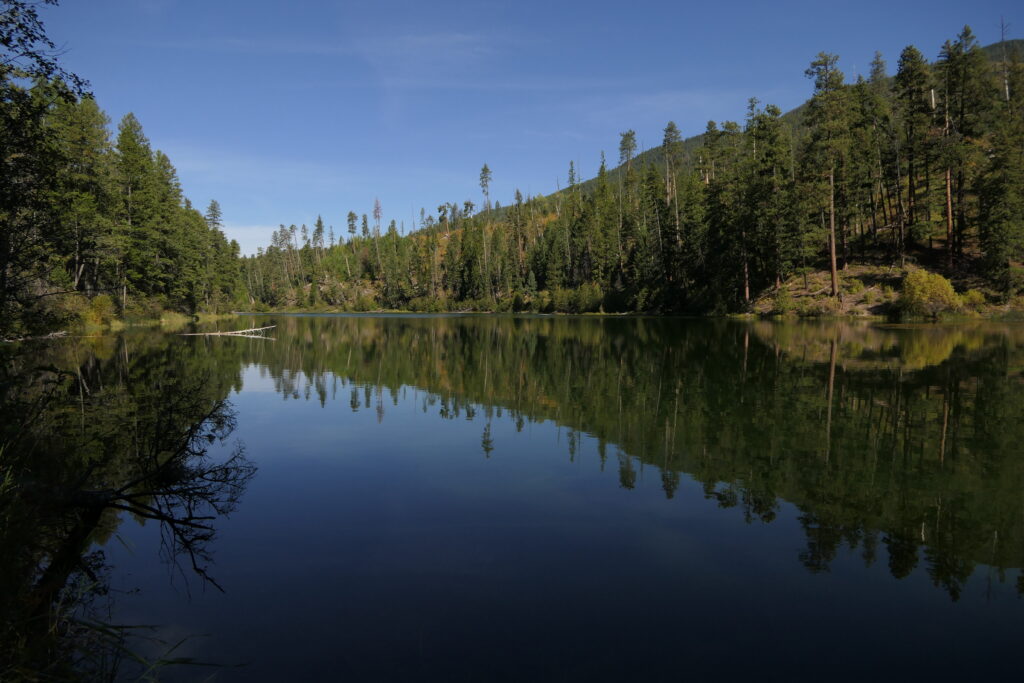 I met Dan from Explore Whitefish at the Smith Lake trailhead where we left my car and headed down to the Swift Creek trailhead. We left the wide parking lot at Swift Creek and descended into the cool, dark forest. Large trees towered above the understory that was changing from green to colors of gold, orange, and red.