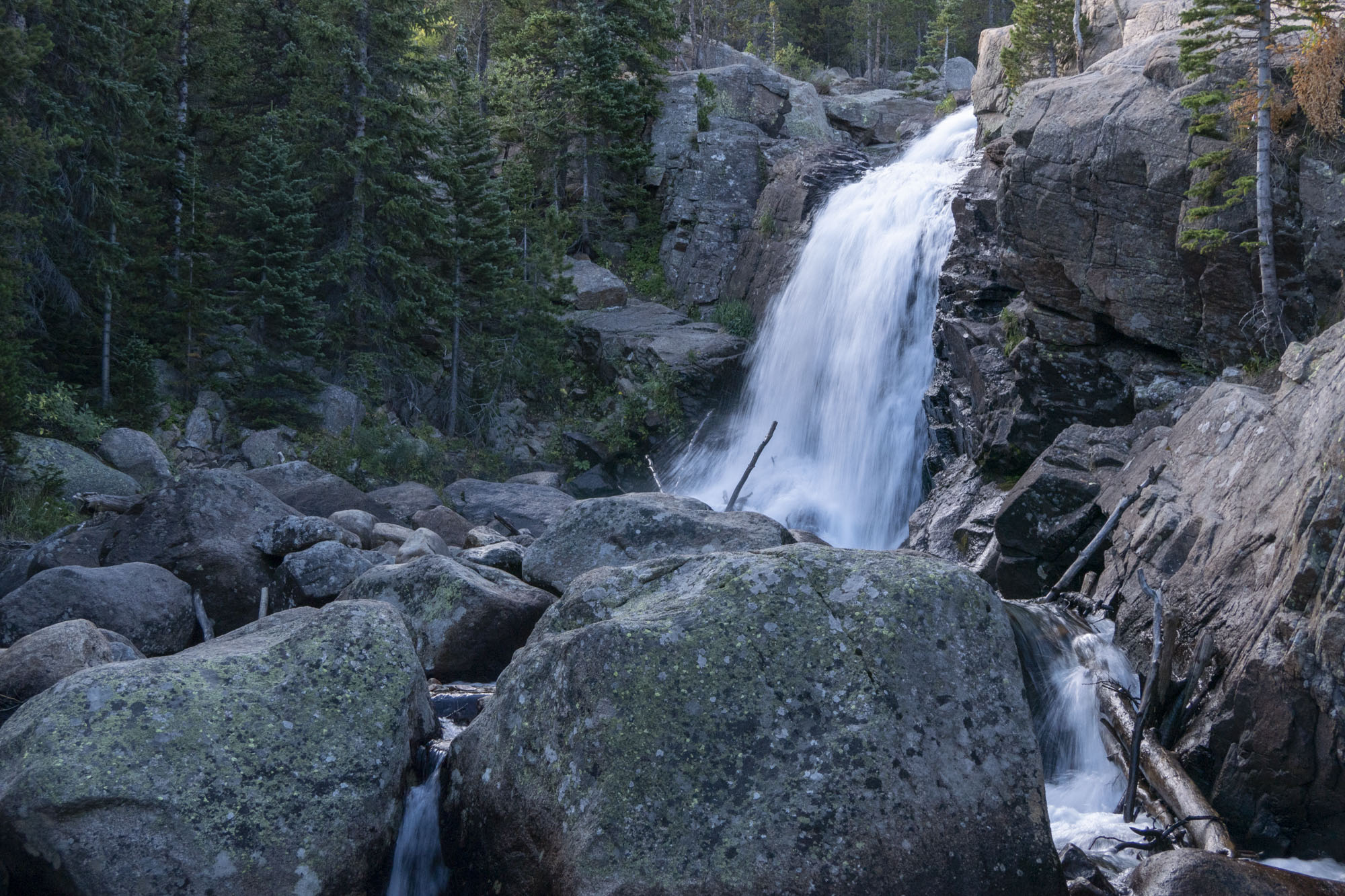 We started out at the Glacier Gorge Trailhead in the cool of the morning. The short hike to Alberta Falls is a popular one and we certainly weren’t alone as we dropped into the forest of pine and aspen. The lovely walk starts out alongside Tyndall Creek which playfully splashes over the boulders.