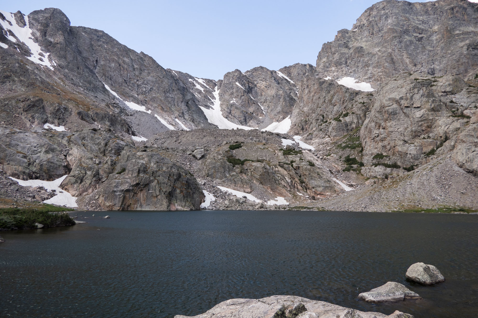 After navigating the boulder field, we were treated the the small, but lovely Lake of Glass. We followed the trail, now mostly just a route, around to the head of the lake and up to Sky Pond. The “trail” was more a collection of well placed rocks, cairns over rocky surfaces, and rows cut out of krummholtz. Wet meadows were interspersed amongst the subalpine fir and shrubbery, but the forest was now behind us as we entered into the upper stretches of the valley.