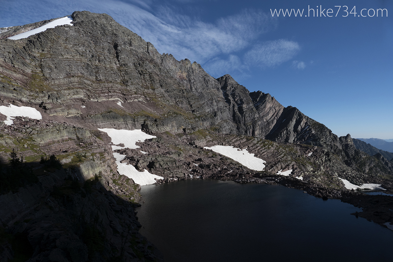 We headed on down near the Little Matterhorn and then walked some wonderful rock slabs up to Comeau Pass, crossed some snow and found our way up to the pass. A one horned goat was uncommonly aggressive in that she eyed us down and then started purposefully walking towards us. Turns out, she was protecting her yearling kid. We gave her space.