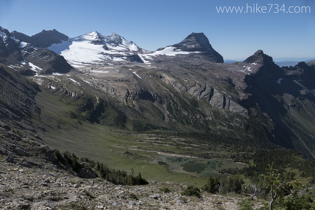 From there, we began climbing up to the basin above Hidden Lake’s south shore where a saddle exists between Bearhat Mountain and Dragon’s Tail. When you first get to the saddle and look over, you are staring down crazy cliffs to Avalanche Lake far below. While incredible, this isn’t the route. Follow the ridgeline south and east for views of Sperry Glacier and Comeau Pass in the distance and Floral Park with Mary Baker Lake below you.