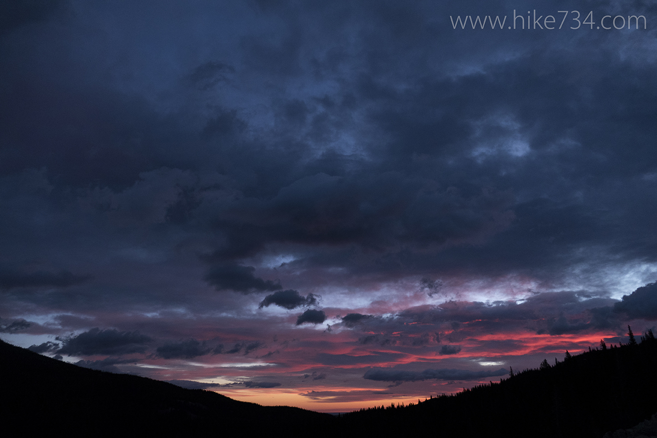 As I approached the survey site, the light began to break and blossomed into an incredible sunrise full of color. I heard pikas around me but, once again, not in the survey site. The sun began to slice through the clouds and kiss the mountains. I finished up the survey, went to camp for the rest of my gear, and headed back up towards Gable Pass.