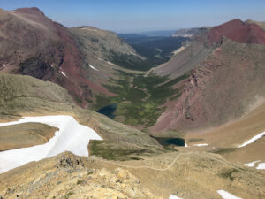 We got to a nice saddle with some more views and, after a bit more scouting, realized that we’d walk the ridge out to just above Siyeh Pass, then drop about 500ft to the trail.