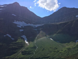 The shuttle dropped us off at Siyeh Bend, and we began our trek along the Piegan Pass trail on a wonderful morning. There was a cool breeze, blue skies, loads of flowers, and running water. Upon reaching the avalanche chute below the two mountains that share a ridge, we went off the main trail and onto the climber’s trail.