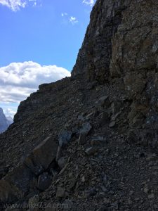 While the more popular route up the mountain is the south face, the more interesting and fun route is across the narrow goat trail that runs diagonally across its north face. It’s not for the acrophobic, but it is perfect for us.