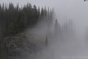 The little pocket views of the gorgeous Middle Fork drainage had clouds obscuring the tops of the mountain ranges. After the switchbacks up to the last section, my favorite, we got more views, albeit more muted than I’ve seen in the past due to the aforementioned clouds. Along the ridgeline of the final approach, the clouds created a mystical environment which was lovely and we stepped over two or three little snow patches. It’s great to see the receding snow so we can get into the high country!